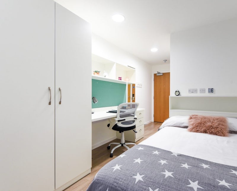 Small double bed, under-bed storage, desk, chair, wardrobe and chest of drawers, full-length mirror