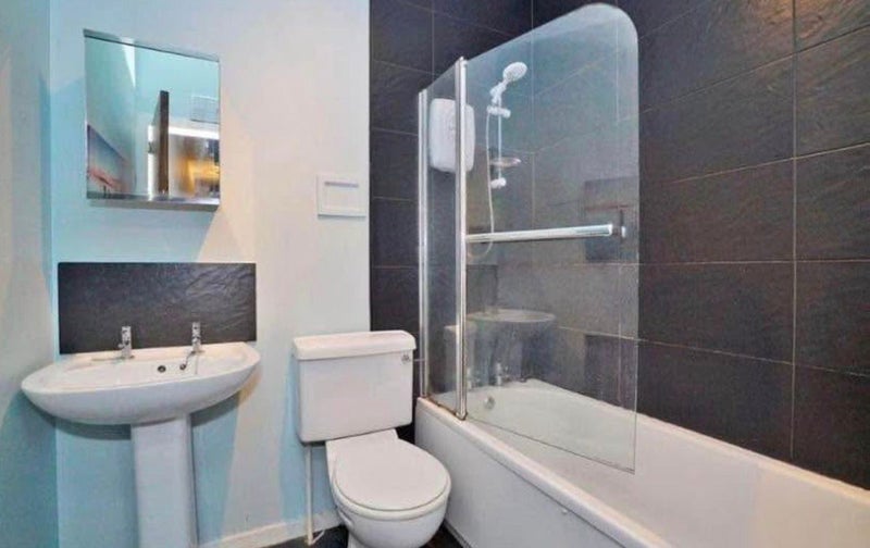 * **The Bathroom:** A bright, modern three-piece suite featuring a bathtub with an overhead electric shower and glass screen, stylish dark wall tiling, and a mirrored vanity unit.