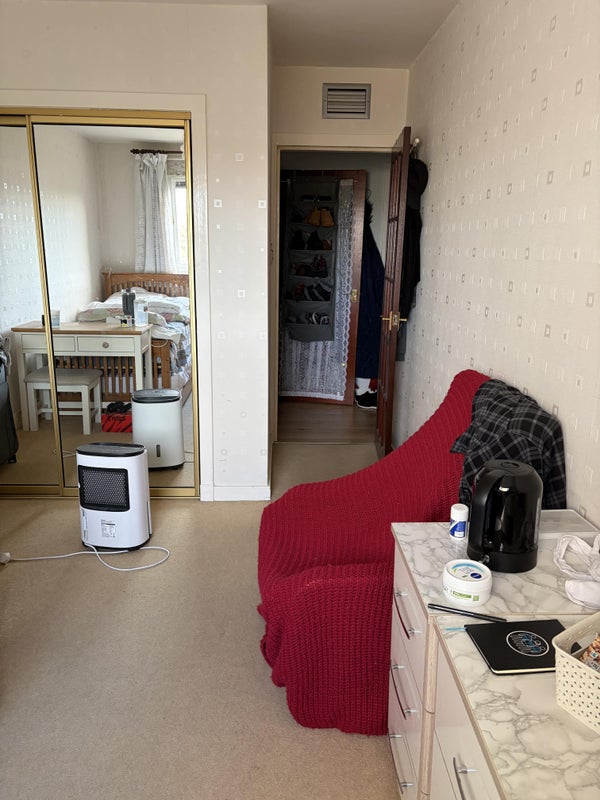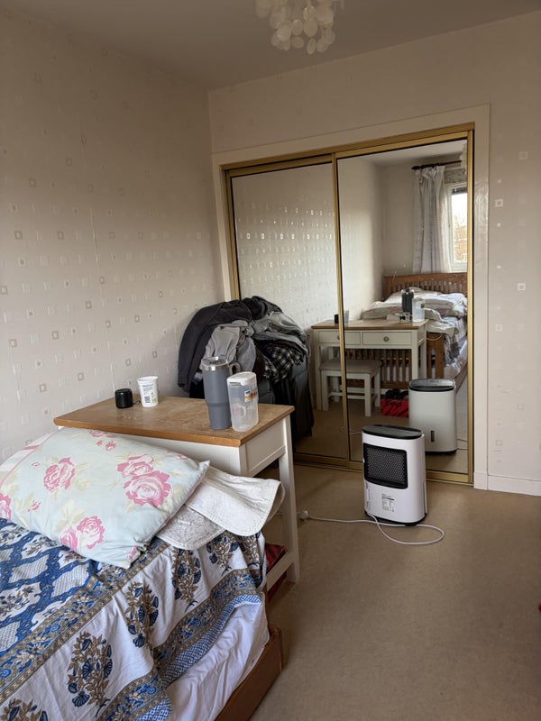 A lovely double sized room fully furnished with a single bed (and trundle bed underneath), comfy chair and dressing table with stool with ample storage in a large chest of drawers, smaller chest of drawers and double walk in wardrobe.