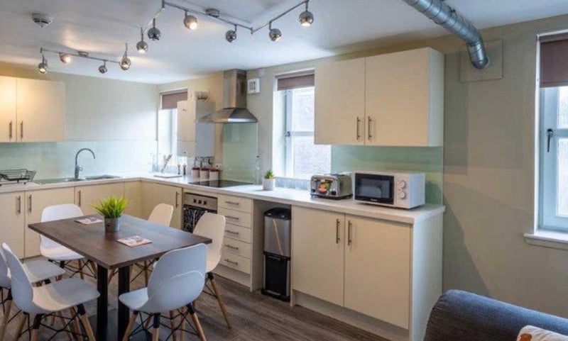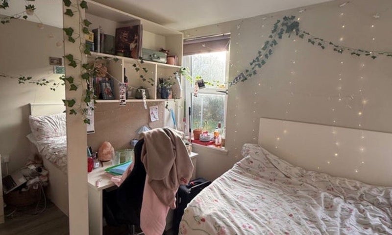 Fully furnished beautiful room with two windows, modern wooden panelling an integrated desk, wardrobe, dresser and huge mirror. Double bed with under bed storage, perfect for any student looking for a cozy, cheap and comfortable place to stay 5 minute walk from Dundee's main campus and 15 minute walk to Abertay University's campus. other tenants very clean, quiet and friendly. The room is fully heated with the radiator as well as under floor heating floor extra warmth. There is a designed cupboard and fridge section in the large shared kitchen. Looking for a tenant asap so please message or phone if interested :)