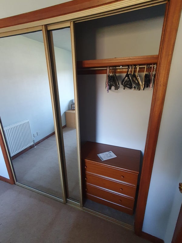 Has double bed, desk and office chair, 2 x drawers and double fitted wardrobes with mirror doors.
