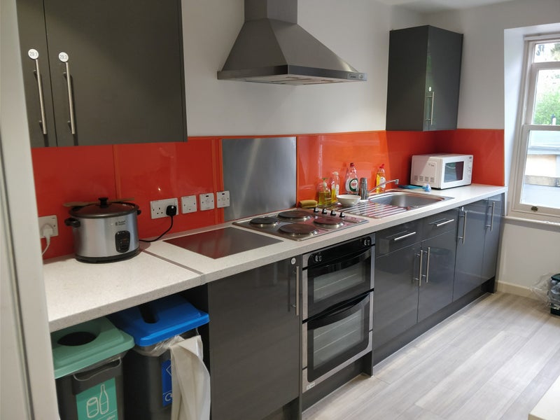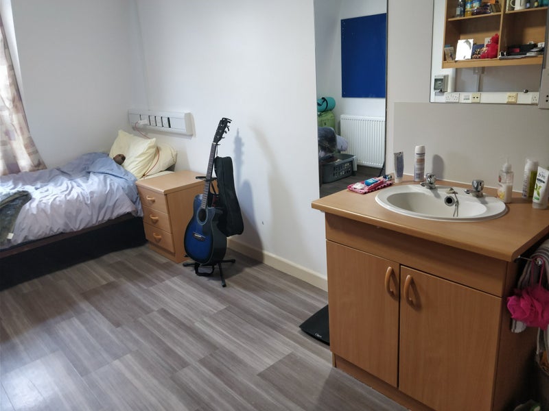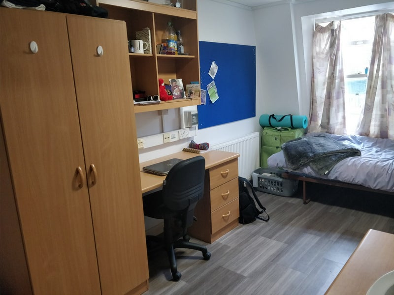 Furnished single room in Pulteney Court with single bed, desk, sink, and closet. Shared kitchen between 5 people and two shared bathroom between the same 5. The room is available whenever but the lease ends in September.