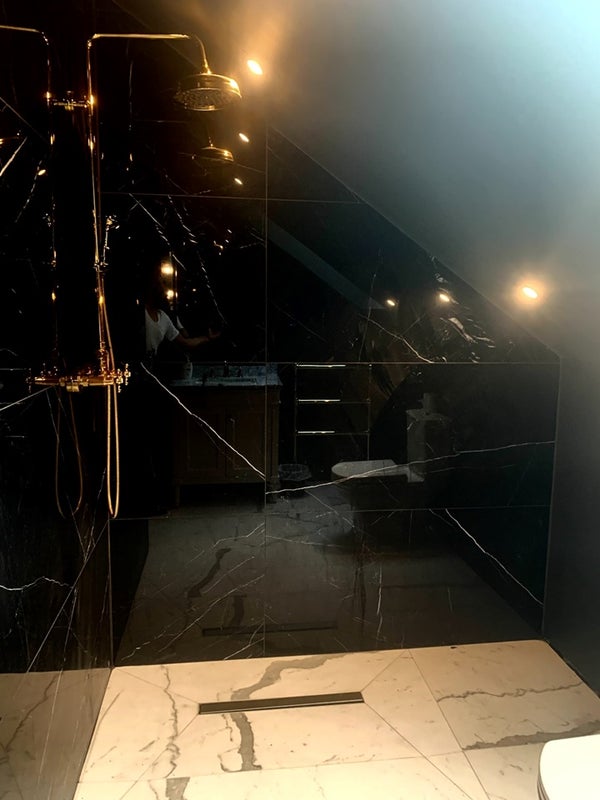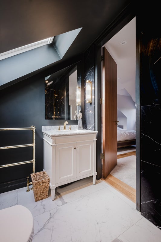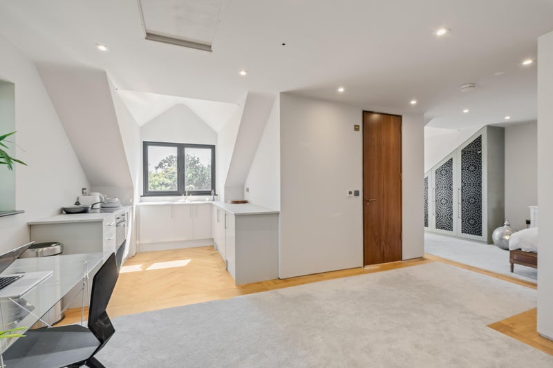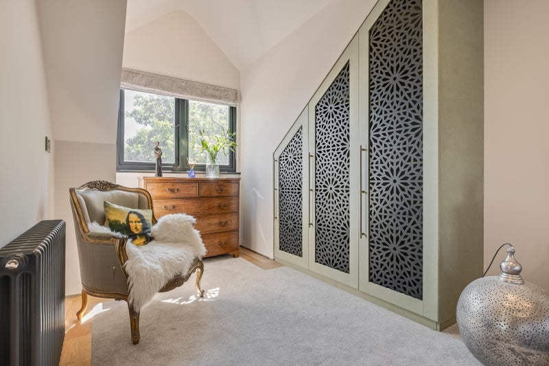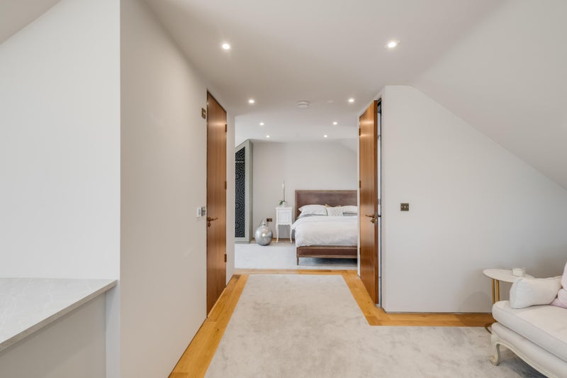 The apartment features a large, light-filled bedroom with fitted designer wardrobes and a superking bed frame with a premium 3000 pocket-sprung mattress, complemented by Roman blackout blinds for comfort and restful sleep.