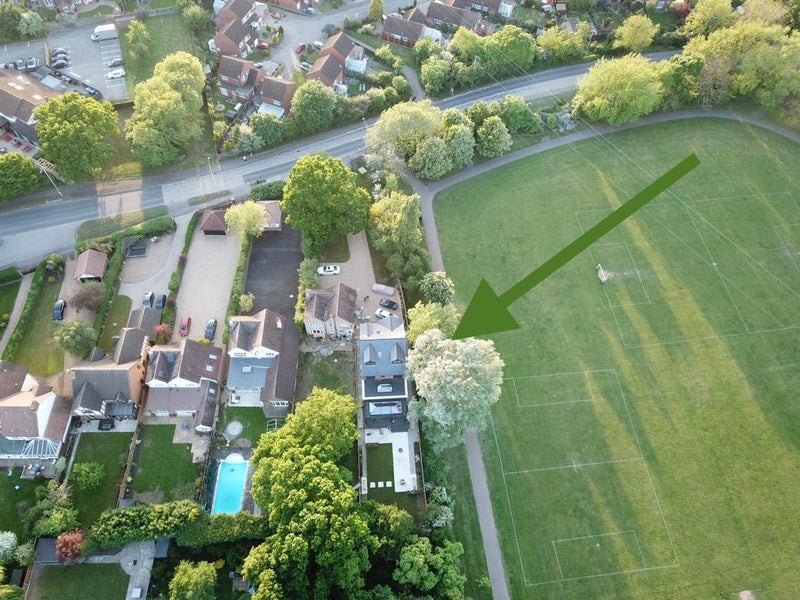 The property is accessed through electric wrought-iron gates via a private gravel driveway, leading to a peaceful and secluded setting. Surrounded by mature trees, open parkland, and expansive green views stretching into nearby hills and woodland, the location offers a rare sense of tranquillity while remaining well-connected.