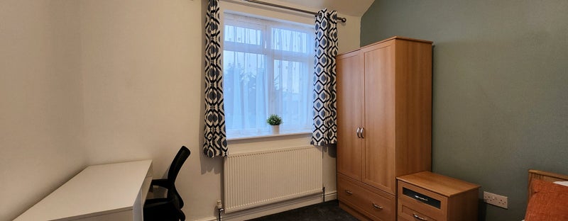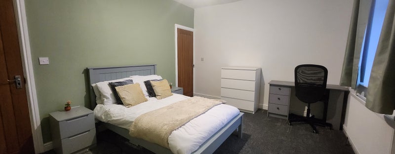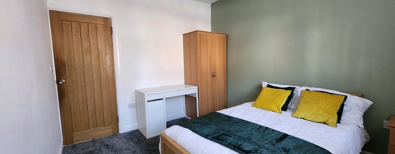 Fully furnished with double bed, wardrobe, desk & chair, chest of drawers + built-in cupboard