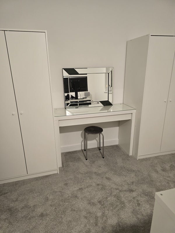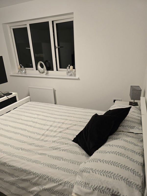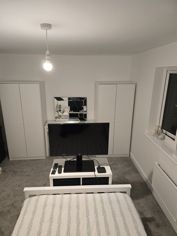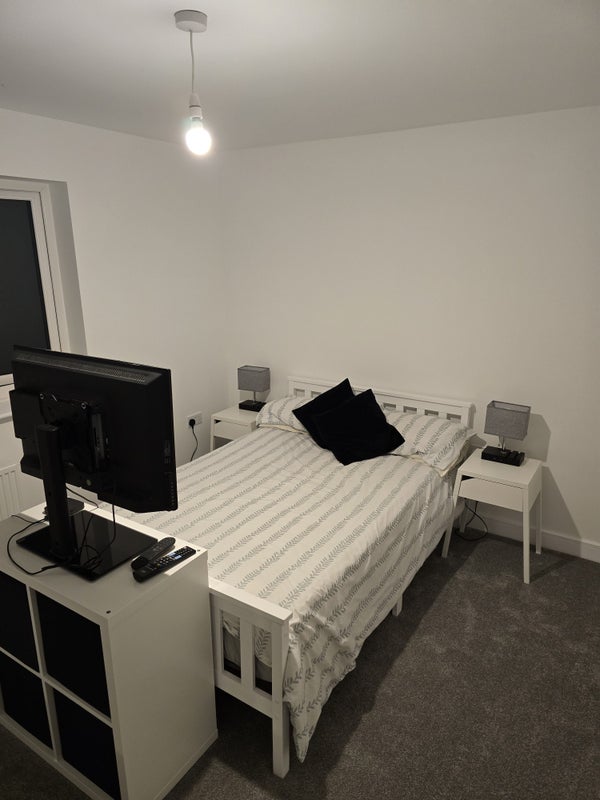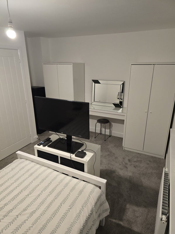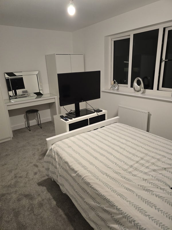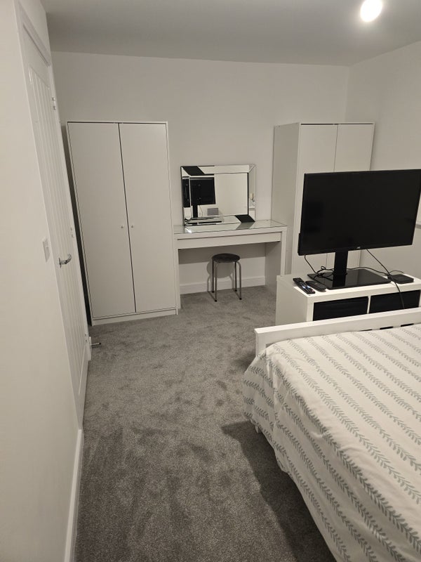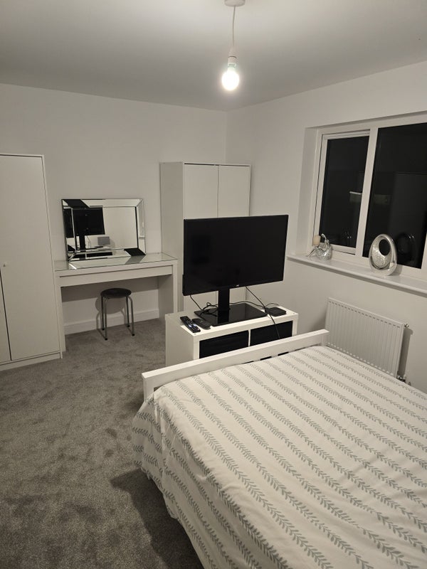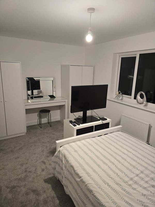 The double bedroom is in a new build home. It has twin cupboards, dressing table and telly with Sky TV.. I have also had a blind fitted to the window since picture was taken.