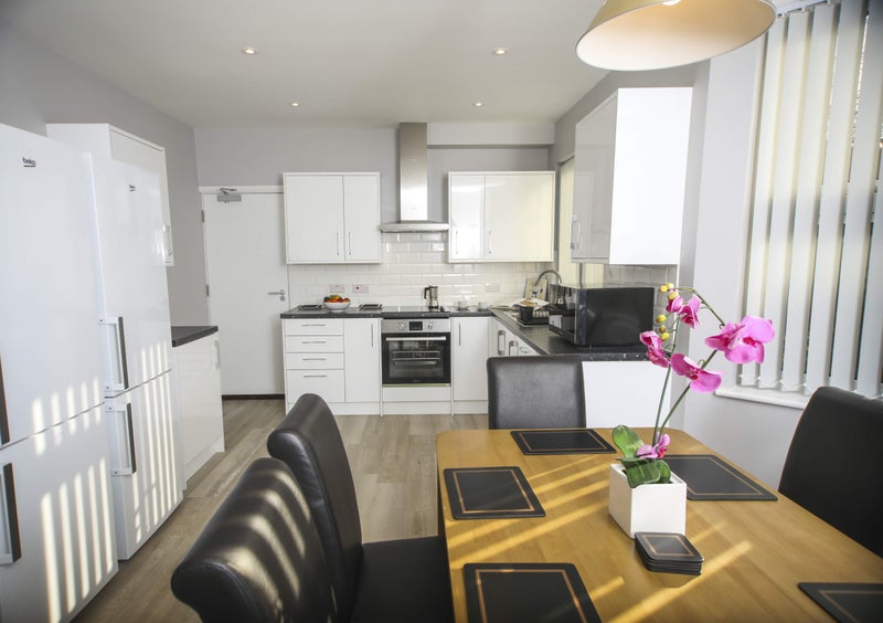 🔹Large, bright and contemporary kitchen/diner, 19.5m2, with Bosch electric hob, externally vented extractor fan, electric oven, 6-seater dining table with chairs, 2 fridges, microwave, 4 slice toaster and electric kettle