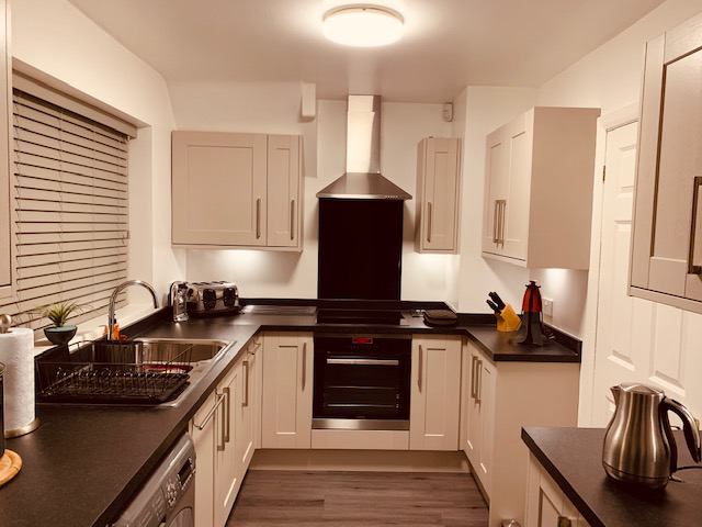 A modern shaker-style kitchen with integrated oven and hob, and quality appliances. It is fully equipped with cookware, kettle, toaster, microwave, and utensils.