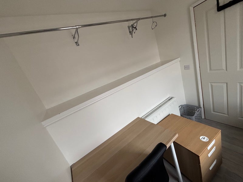 The room comes with a single bed, desk and chair, drawer unit, and clothes rail. It’s a comfortable, tidy space — ideal for a working professional or student looking for affordable accommodation close to transport links.