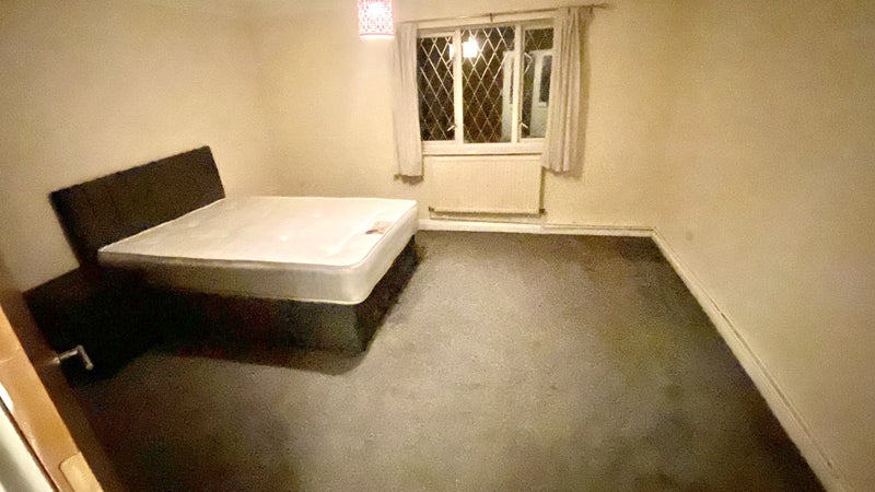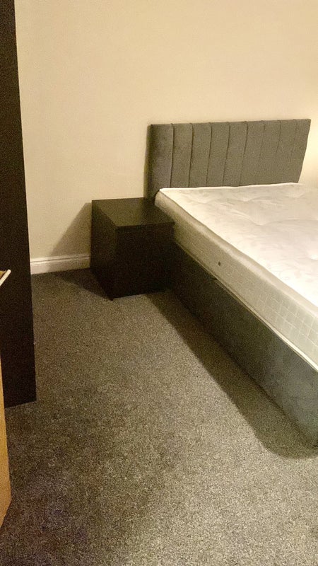 Large double room consisting of bed, bedside cabinet and fitted wardrobe.