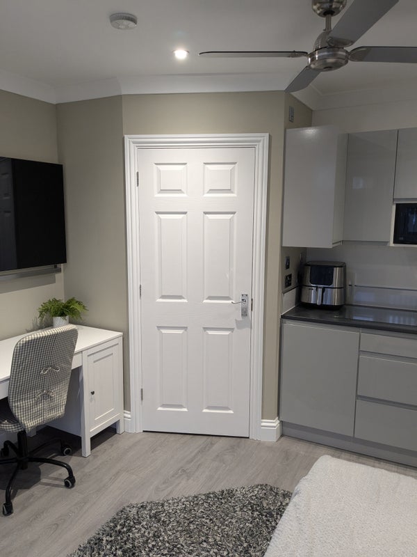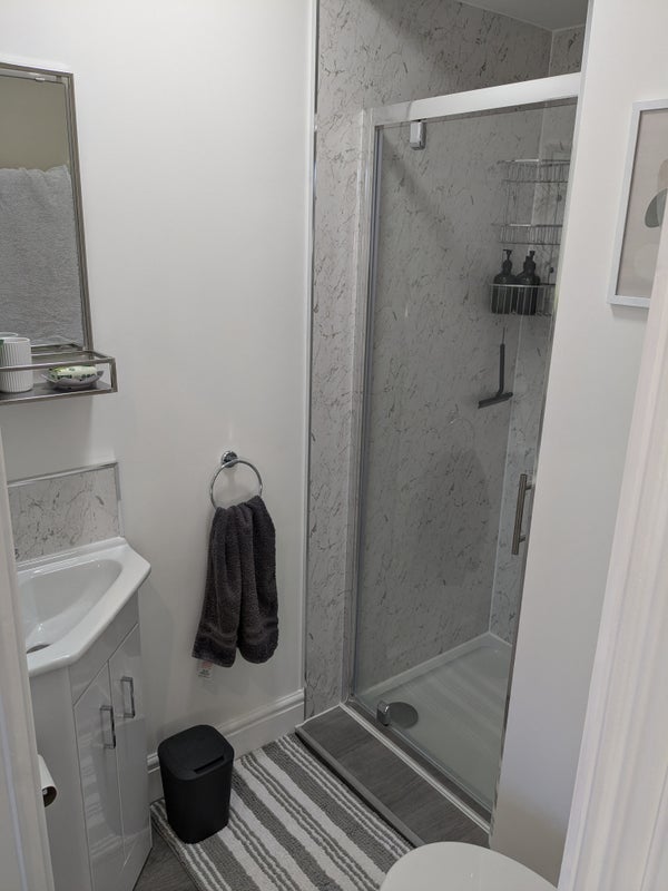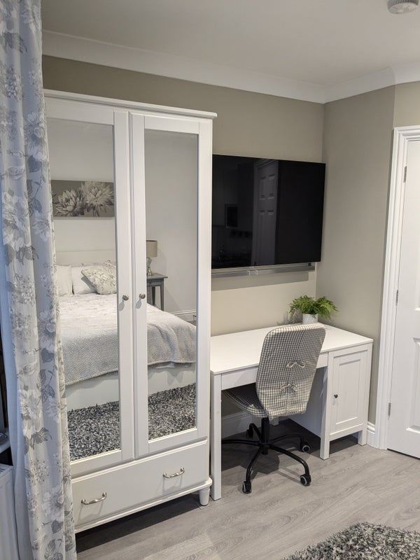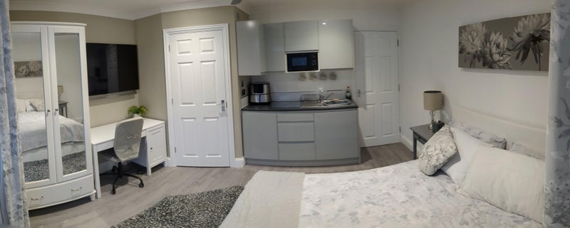 The bedroom is self-contained and is provided with everything required to move straight in, this includes crockery, utensils, to bed linen and towels. It has a large bay window which lets the light flood in. It has a freestanding wardrobe which has a large full size mirror, desk area with LED TV. The kitchenette has a fridge, microwave and air fryer to cover all the modern needs. The double bed has two wheeled under bed drawers for extra storage. The en-suite shower has an 800mm x 800mm shower with a pivot glass door, toilet, sink and extractor fan. The bedroom room also has a ceiling fan for the warmer climate days.