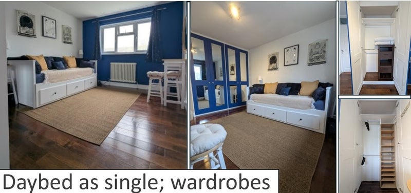 YOUR SPACES: the room has a daybed that converts from a single (for space, entertaining, etc.) to a slightly-larger-than-double (155x190 cm). There is also a smart TV (2.1 speakers), two double built-in wardrobes, and a vanity/desk. Bed linens are provided. You will have private use of a toilet/cloakroom (shower/bath rooms is shared with me). You would be asked to clean your spaces and tidy-up after yourself in shared areas.