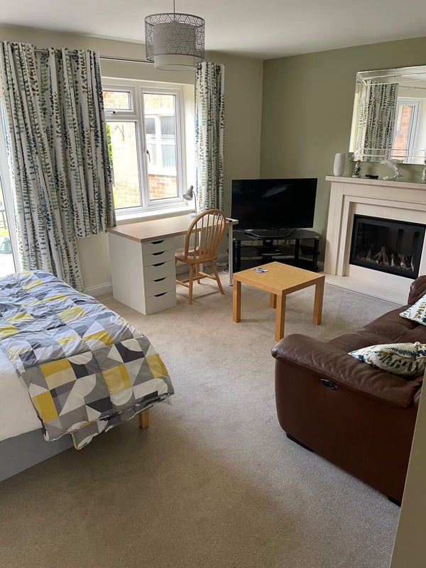 This delightful very large double room consists of a John Lewis double bed/mattress, 32 inch colour TV, desk/chair, leather recliner settee and double wardrobe.