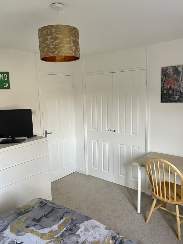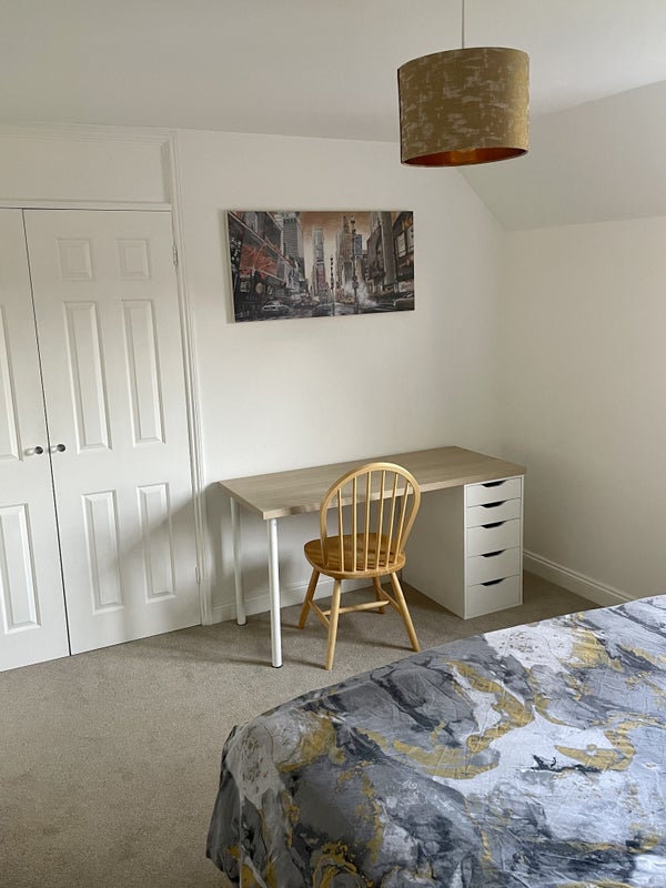 Large double bedroom with a lovely King Size bed, fitted double wardrobe. Desk and chair, draws and TV