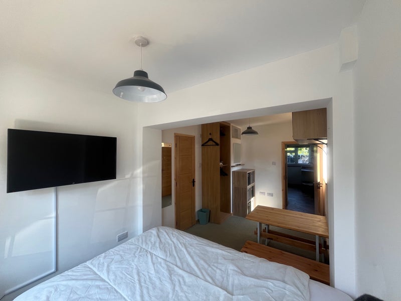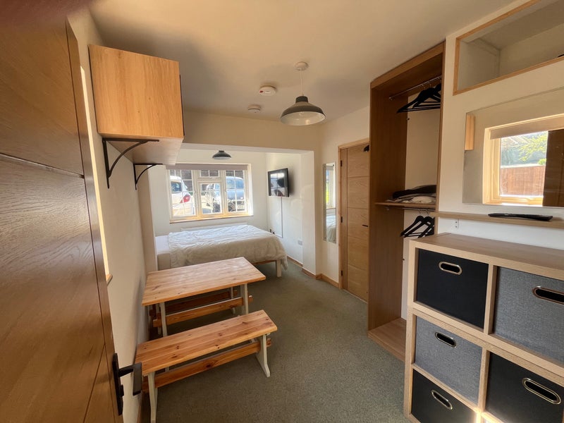 * Large bedroom/living area with double bed, TV, table & chairs