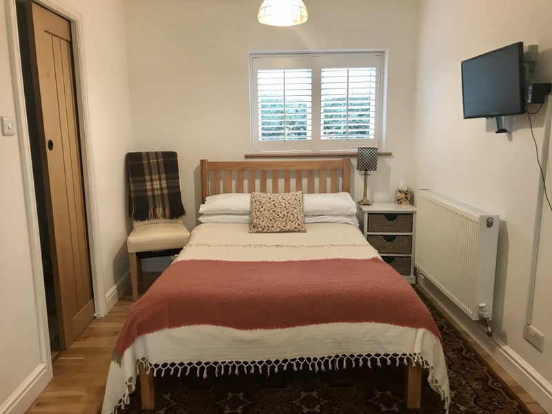 Small Double bed with en suite shower room, good sized wardrobe, kitchen and sitting area (small sofa)plus breakfast bar and stool. WI-FI, TV available on request secure off-road parking. All bills included.