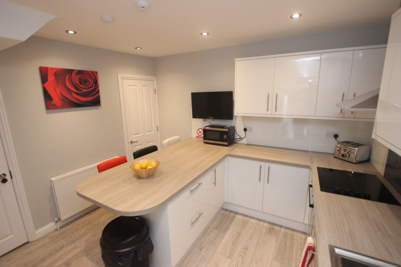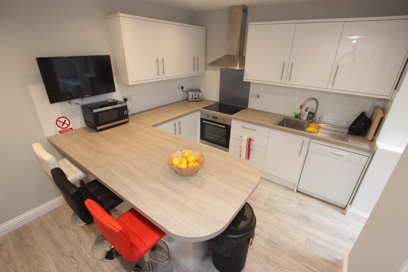 Fully fitted designer kitchen with dishwasher, freezer, and ample fridge/cupboard space