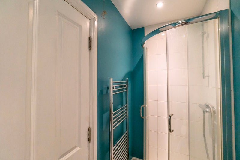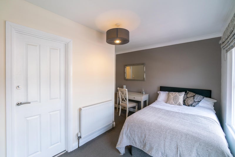 Room 1 😀 - A beautiful ground floor ensuite room at £750 pcm, available immediately, fully furnished with a double bed & under bed storage, wall mounted SMART TV, bedside table with a lamp, a reading chair, a large wardrobe and a desk & chair. The ensuite has a towel radiator and cabinet for toiletries.