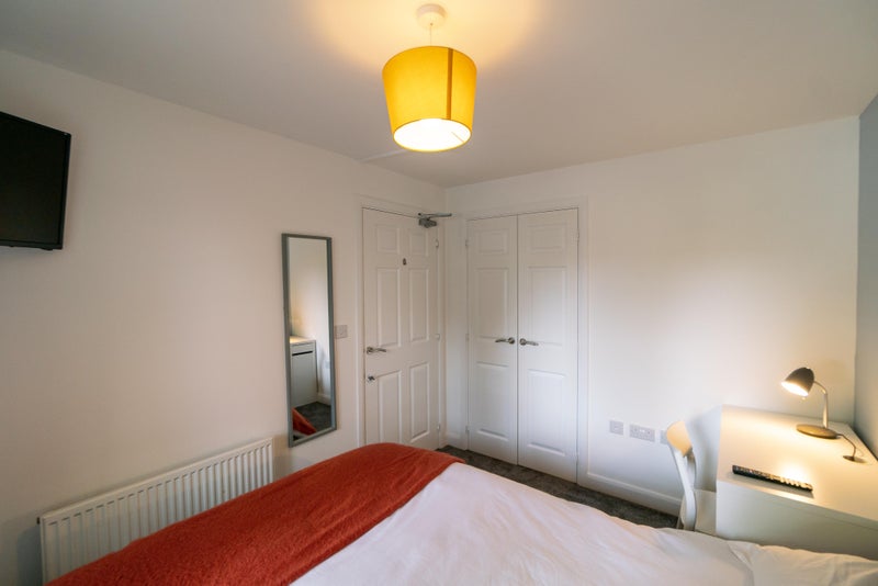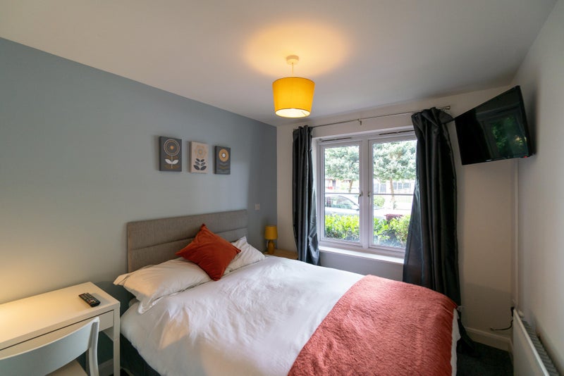 Room 2 😀 - A beautiful ground floor double room for £725pcm available 21st March 2026, fully furnished with a double bed & under bed storage, wall mounted TV, bedside table with a lamp, a large wardrobe and a desk & chair.
