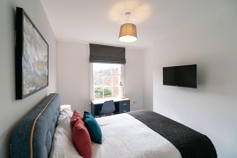 Room 3 😀 - A beautiful first floor ensuite room available for £795 pcm, available 4th April 2026, fully furnished with a double bed & under bed storage, wall mounted SMART TV, bedside table with a lamp, wall mirror, large wardrobe and a desk & chair.