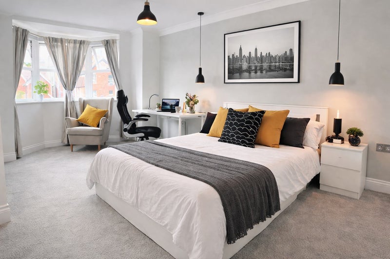 As standard, ALL rooms come complete with a high-end furniture pack, including a Double Bed, Mattress, Large Wardrobe, Chest of Drawers, Bedside Table, Work Desk & Chair.