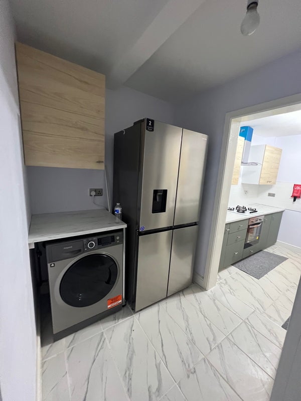 Beautiful comfy super large double room with everything you need to live! Comes with laminated floors, 32 inch smart TV, super fast broadband, brand new double bed, mattress, oak wardrobe, desk, chair chest of drawers. In the living room you have comfortable dining and sitting space with communal smart TV. Fully fitted new kitchen with washer dryer, american fridge freezer, dishwasher and all facilities. Access to downstairs toilet/shower and also access to upstairs bathroom. Includes all bills and council tax.