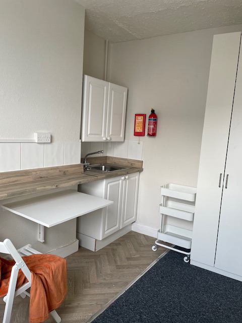 Room has small kitchenette with combination oven/microwave and hob. Shared bathroom and toilets.