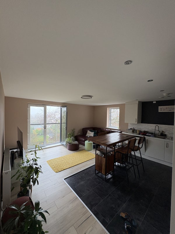 The living room has equipped with a 65” top of the range LG OLED TV and a leather sofa.