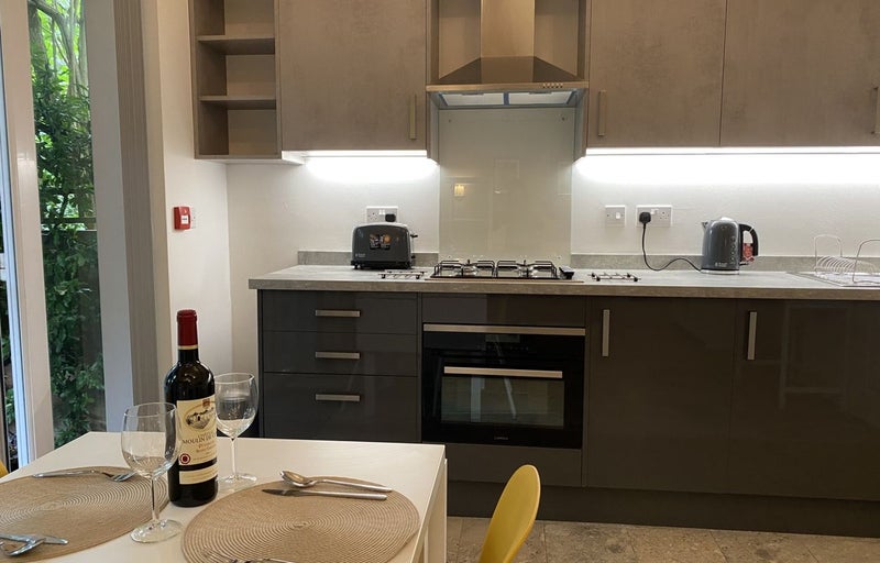 Shared spaces include a well-equipped kitchen with all essential appliances, a large dining/living area, and a beautifully maintained garden with a small terraced area—perfect for summer evenings.