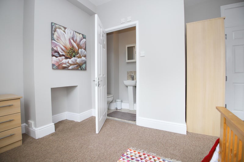 The bedroom is on the first floor and is £850 per month, offering a generous-sized bedroom with an ensuite. It includes a double bed, wardrobe, bedside table, and chest of drawers.
