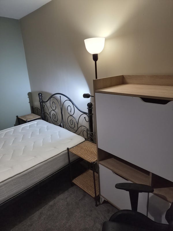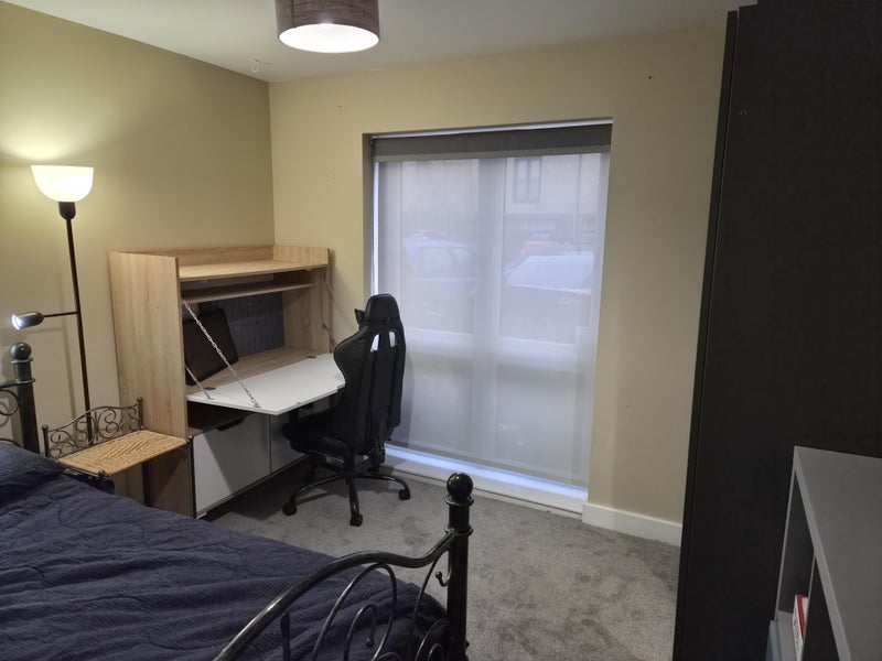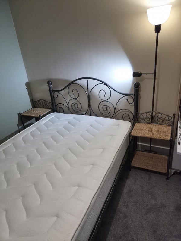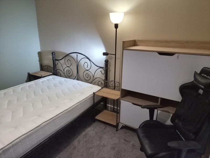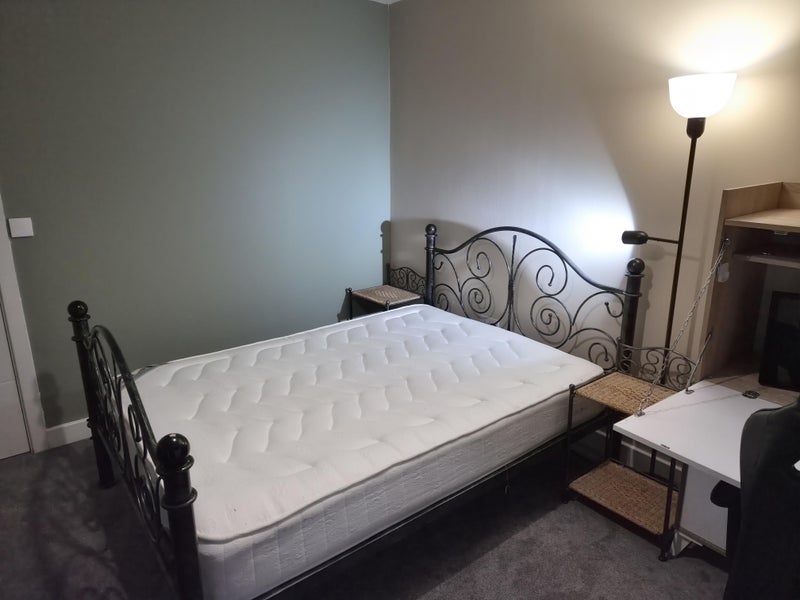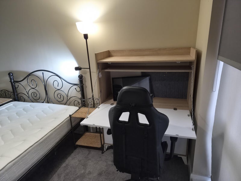 - Fully furnished – quality ornate double bed frame, bedside tables, desk with storage hutch and chair
