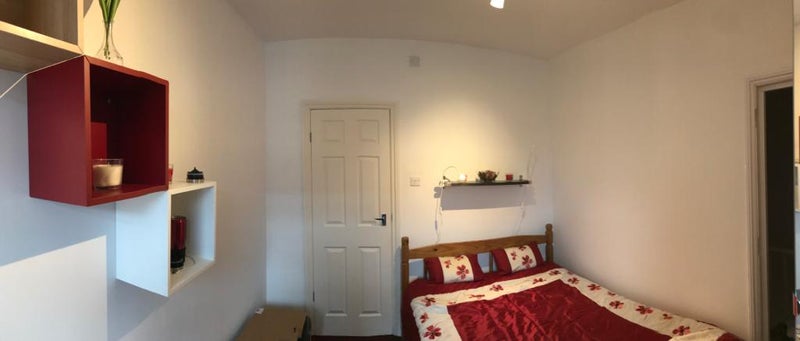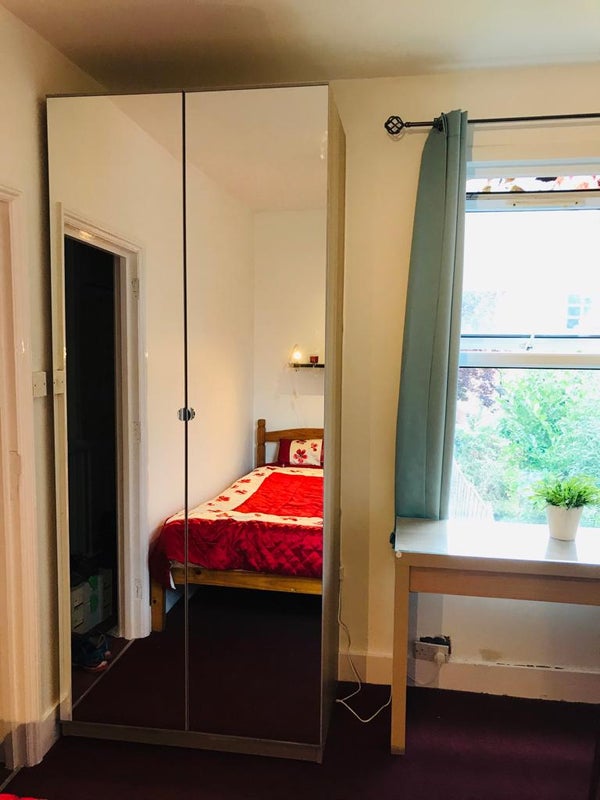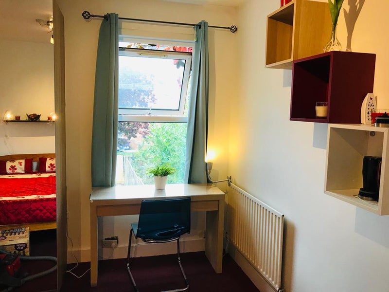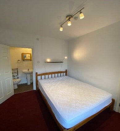 This beautiful ensuite bedroom is located on the first floor of the house. It is fully furnished, featuring a double bed with mattress, a mirrored wardrobe with interior lighting, a desk and chair, and an ensuite bathroom with a powerful hot shower.