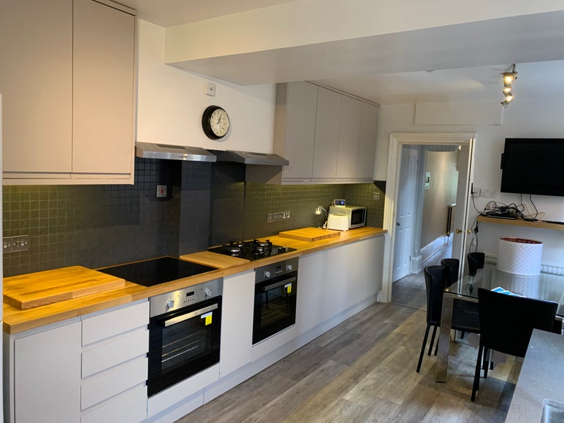 The large shared kitchen living room includes a granite worktop as well as a polished solid oak worktop, contemporary soft-close mushroom coloured, handle-less doors and a tap that produces instant boiling water. There is a wall mounted 43” Sky Glass Qled Ultra 4K TV so you can watch a load of subscription channels including Sky Atlantic and Netflix when you cook or relax on the soft leather John Lewis chairs. The kitchen comes with all you would expect to see in a property of this quality and size such as two stylish black glass hobs (one gas, one electric), two stainless steel electric fan ovens, a microwave oven, air fryer, toaster and a hot tap that delivers boiling water (no need for a kettle - did we mention this already....). We provide ample personal allocated space in fridge, freezer and cupboards (c1m3) as well as Miele washing machine and a tumble dryer.