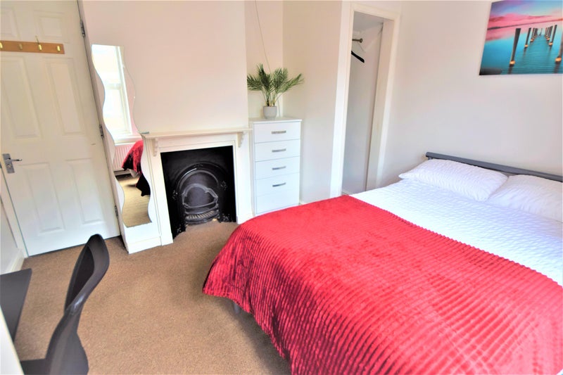 > Double Room is furnished with a double bed, wardrobe, desk, drawers and a chair. Desk can be upsized