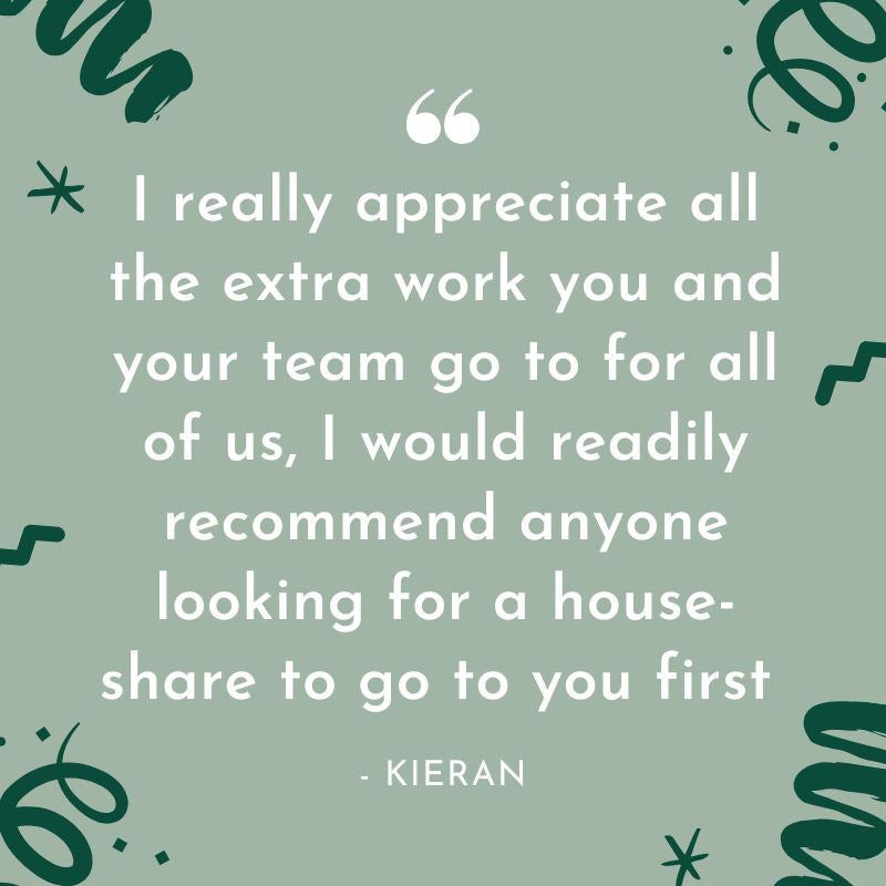 CJ: "I want to personally thank you for your amazing work with us, your tenants. You are a fantastic Landlord, always looking out for us, with a great attitude and willing to help with everything you can to make us feel comfortable and at home in our rooms. I am genuinely thankful for your service and have been very happy during my stay in 2 Nelson News which is in part thanks to you and your hard work. Im very sad I have to leave but Im confident I will come back to the UK and I will certainly contact you when I do to see if you have a room available for me"