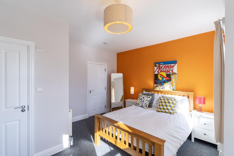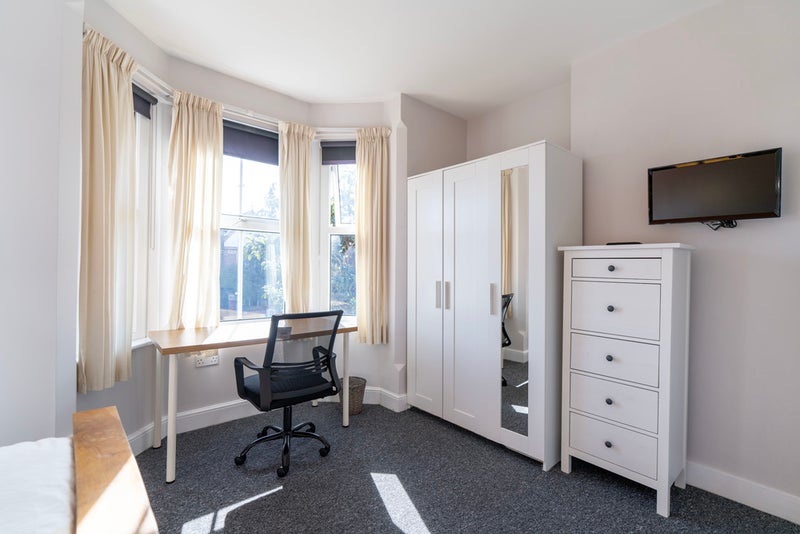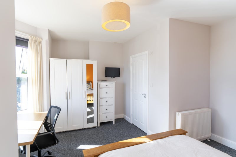 Room 5 😀 - A beautifully, spacious first floor ensuite room for £825 available immediately, fully furnished with a double bed & under bed storage, wall mounted TV, bedside table with a lamp, a large wardrobe and a desk & chair. The ensuite has a towel radiator and cabinet for toiletries. This room is newly decorated and has had a brand new carpet fitted.
