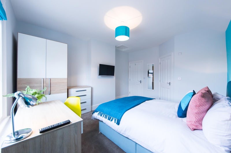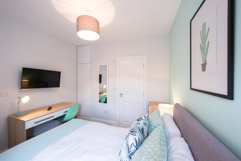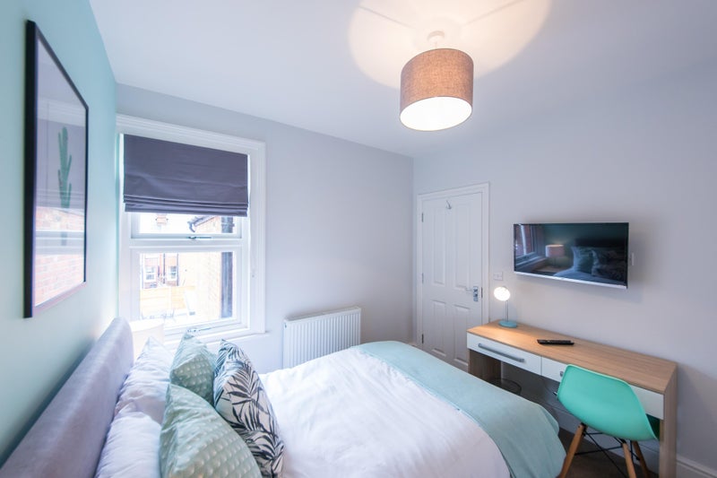 Room 4 - A spacious first floor ensuite room for £795pcm available 4th April 2026, fully furnished with a double bed & under bed storage, wall mounted TV, bedside table with a lamp, a large wardrobe and a desk & chair. The ensuite has a towel radiator and cabinet for toiletries.