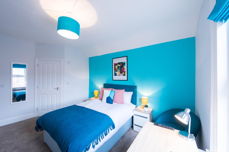Room 5 - A spacious first floor ensuite room for £725pcm available 3rd March 2026, fully furnished with a double bed & under bed storage, wall mounted TV, bedside table with a lamp, a large wardrobe and a desk & chair. The ensuite has a towel radiator and cabinet for toiletries.