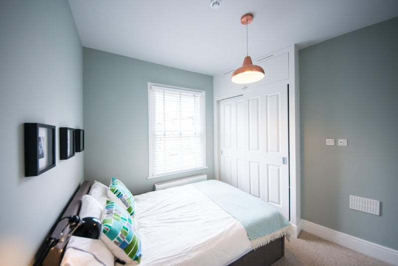 Room 6 😀 - A beautiful first floor ensuite room for £795pcm available immediately, fully furnished with a double bed & under bed storage, wall mounted TV, bedside table with a lamp and built in wardrobe. The ensuite has a towel radiator and cabinet for toiletries.
