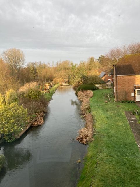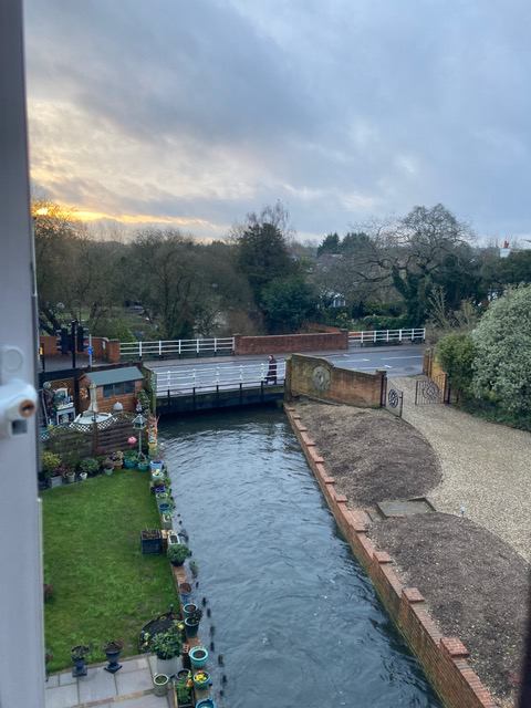 The kitchen and living room have a gorgeous view out over the River Lambourn, where you can watch the sunset. The bedroom also has a view onto the other side of the river.