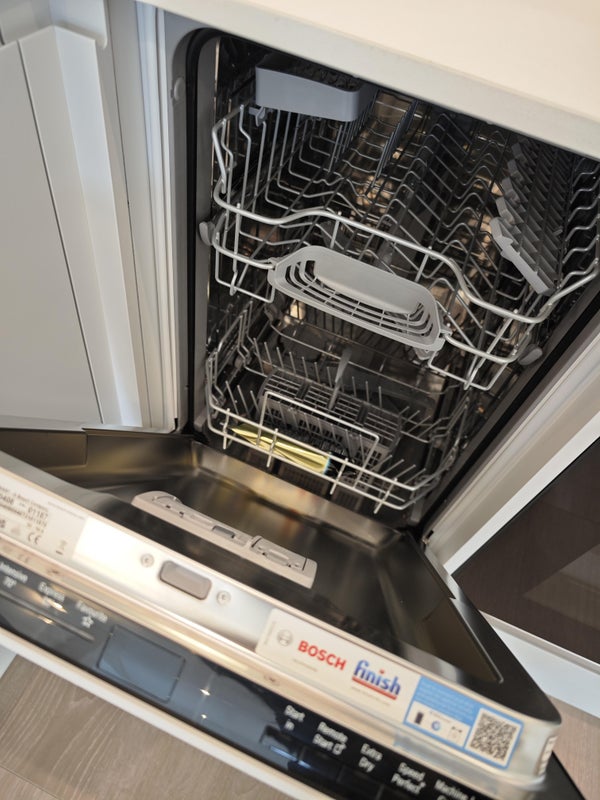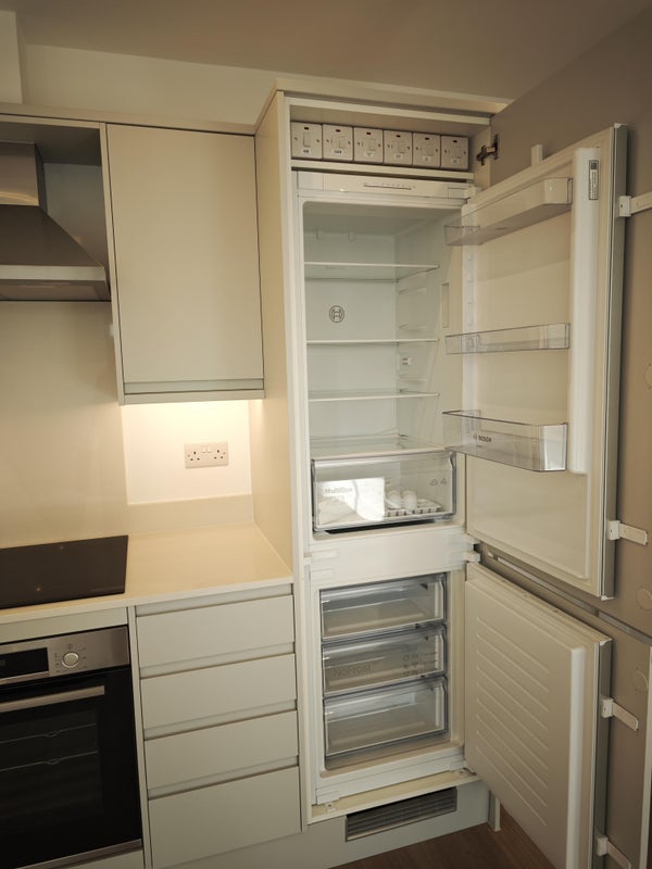 The apartment itself is thoughtfully designed with modern living in mind. Upon entering, residents are welcomed by a generous open-plan space that seamlessly integrates the kitchen, dining, and lounge areas. Large windows flood the room with natural light, giving the space a bright and airy feel. The kitchen is fully fitted with sleek cabinetry and quality integrated appliances, allowing for a clean, modern finish that complements the overall aesthetic of the home.