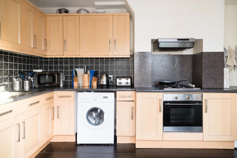 The available room is in fantastic condition, including a large bed, wardrobe, and sofa. There is a shared kitchen with all modern amenities including washing machine and dryer, dish washer, and microwave.