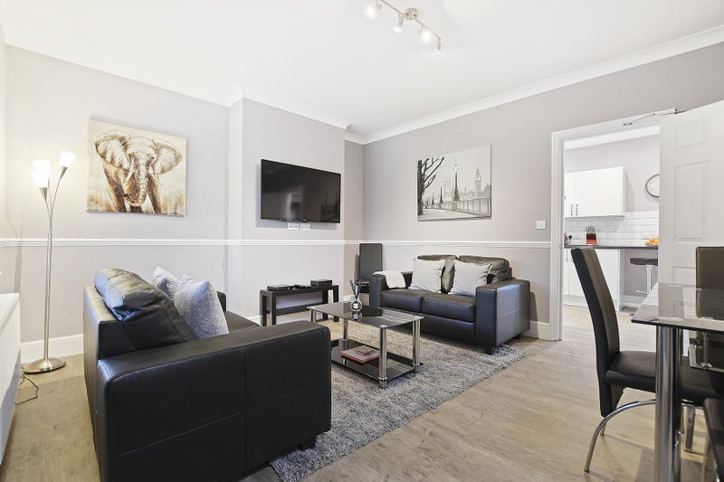 The separate, spacious living room has 2 sofas, a separate dining table, 50" flat screen Smart TV connected to the internet, with Blu-ray DVD player, Virgin recordable TiVo box with 130 plus channels.