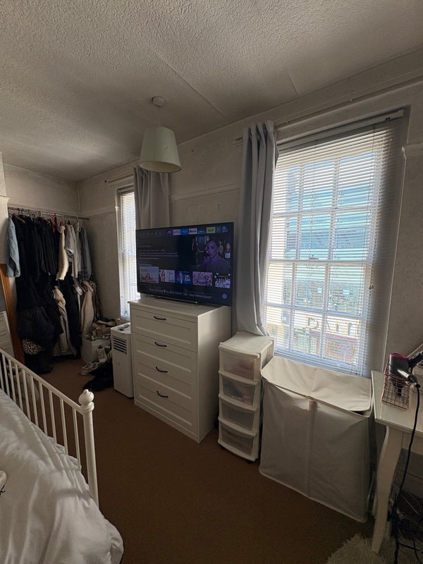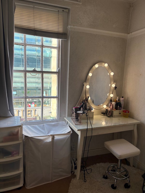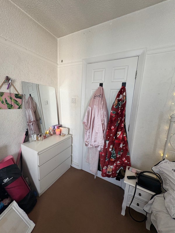 Furniture included with room: bed and bed frame, ikea set of 3 drawers and mirror, clothes railings, dressing table, box unit, full length mirror.