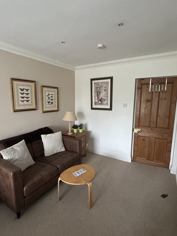 Double Bed. single wardrobe, full length mirror, bedside tables, sofa, smart TV, coffee table. Bedside lights, ceiling spots (with dimmer) + tower fan (in summer). Centrally heated. Large window to front of property.