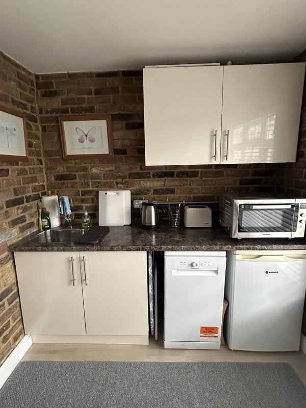 2. Separate Room - Kitchen comprising: Base and Wall level units, Sink, Fridge/Freezer, Microwave/convector oven/grill combi, air fryer, dishwasher, hot plate, kettle, toaster. Sufficient crockery and utensils for meal prep. A small dining table & chairs. Large window to rear aspect of property.