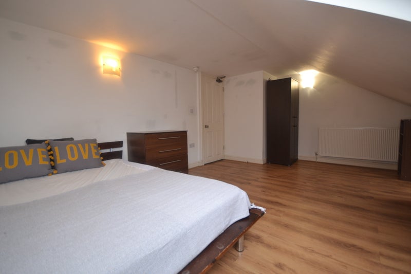 Room 5 – A large bedroom situated to the top floor of this 6 bedroom house which has plenty of character with its sloping ceilings. There is a double bed, wardrobe, chest of drawers and wood flooring.