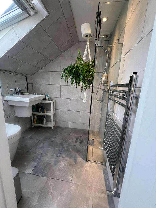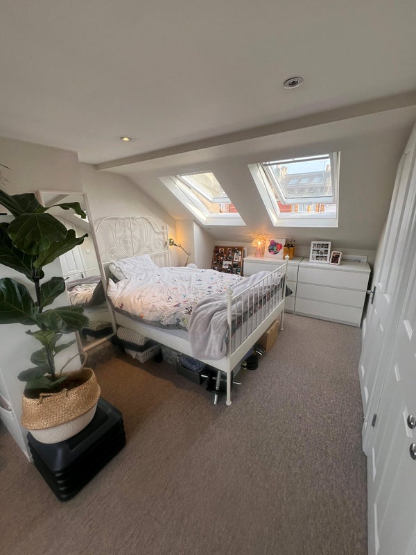 The room is a lovely, sunny and spacious loft conversion with a built-in wardrobe. The bedframe is for sale if needed and there's space for a desk, cupboard and other bits that you may want to add as you can see.