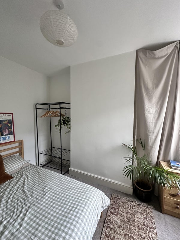 The bedroom is fully furnished -- double bed, clothes rail, chest of drawers, under-bed storage. Bedding/towels can also included if needed. The room for rent does have the boiler in it, it isn't very noisy but not the prettiest so we have hidden behind a drape -- welcome to move that if you prefer, we're easy.