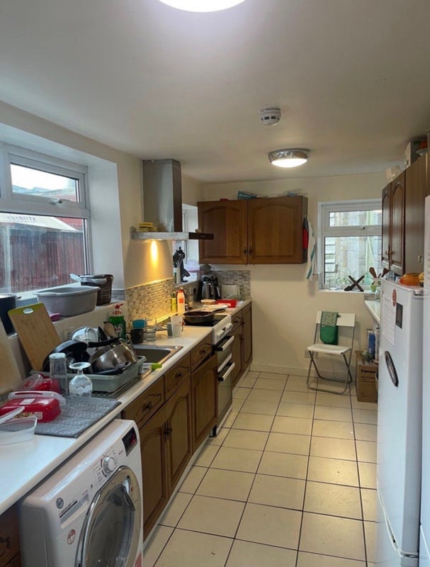 The house is a spacious three-storey five bed with large shared living room and kitchen, and an outdoor area for storing bikes etc.